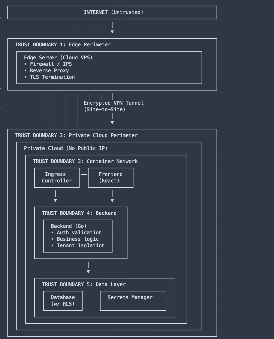 Residual Risk: If the edge VPS is compromised, attacker gains tunnel access to private cloud. Mitigation: Defense in depth—application-layer authentication still required.